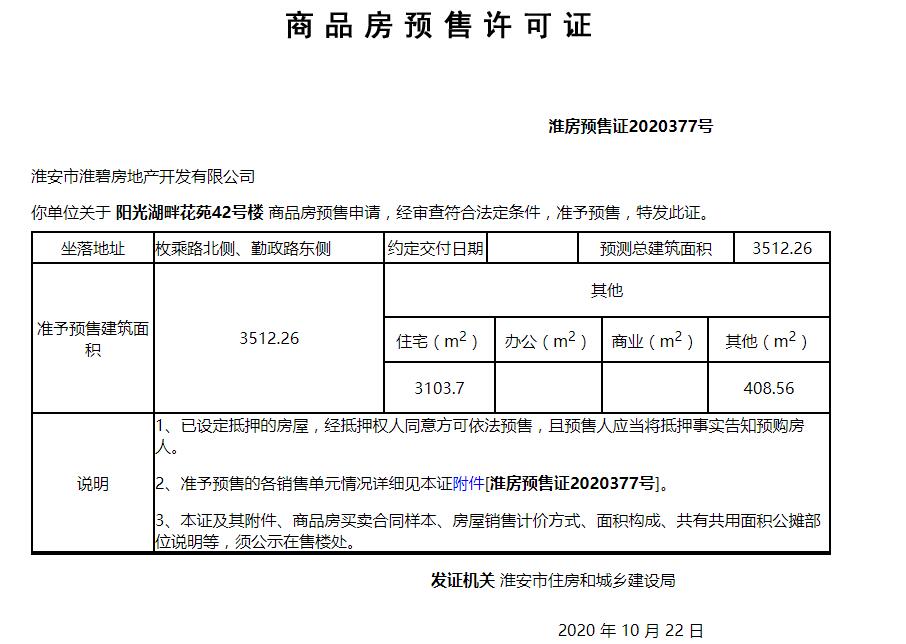 - 淮房预售证2020377号 详情发证时间 2020-10-22绑定楼栋42号楼证件照片