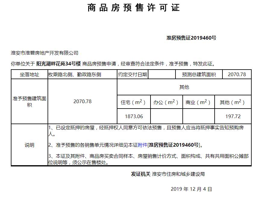 - 淮房预售证2019460号 详情发证时间 2019-12-04绑定楼栋34号楼证件照片