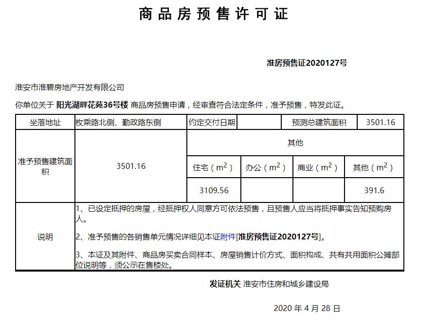 - 淮房预售证2020127号 详情发证时间 2020-04-28绑定楼栋36号楼证件照片
