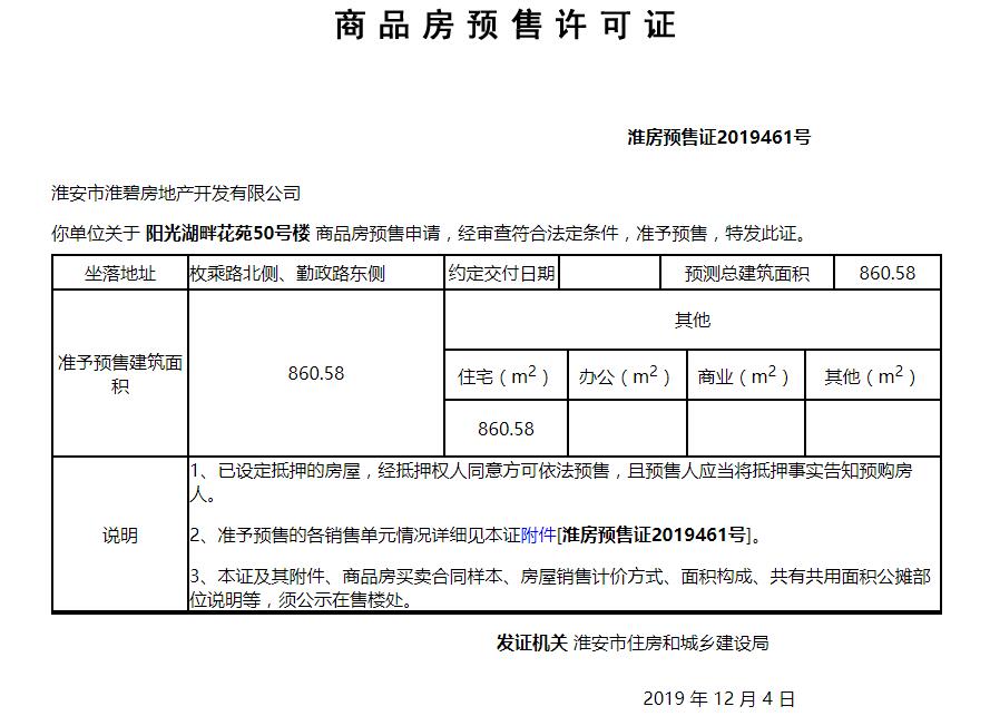 - 淮房预售证2019461号 详情发证时间 2019-12-04绑定楼栋50号楼证件照片