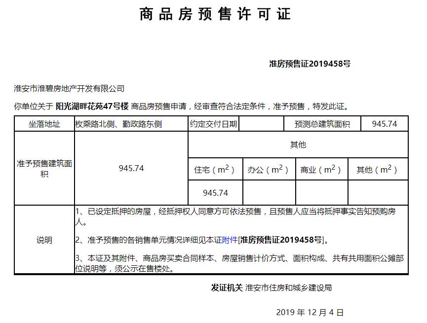 - 淮房预售证2019458号 详情发证时间 2019-12-04绑定楼栋47号楼证件照片