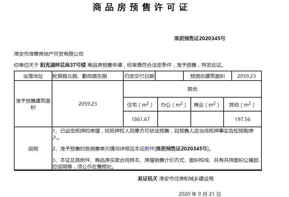 - 淮房预售证2020345号 详情发证时间 2020-09-21绑定楼栋37号楼证件照片