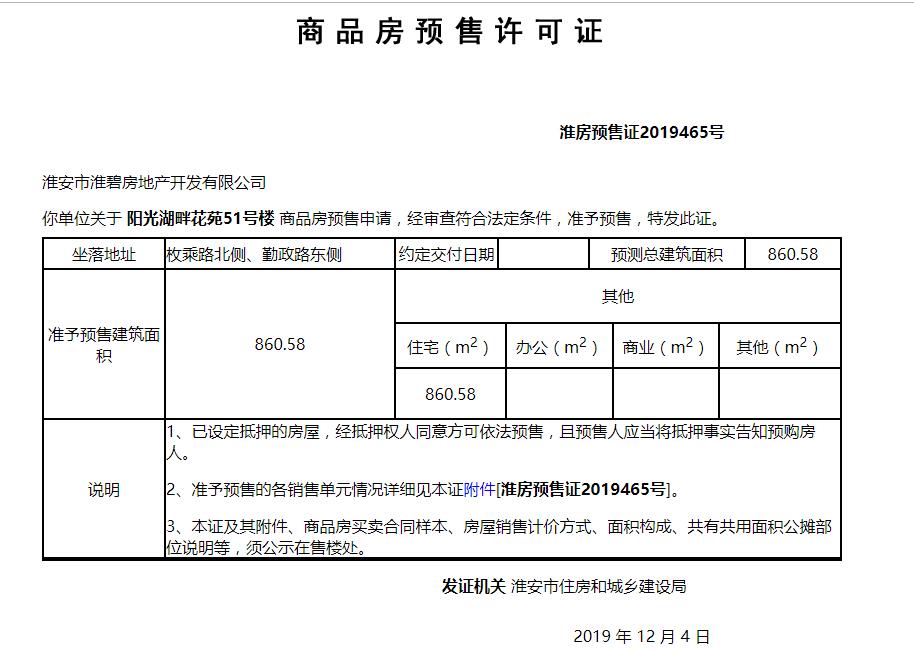 - 淮房预售证2019465号 详情发证时间 2019-12-04绑定楼栋51号楼证件照片