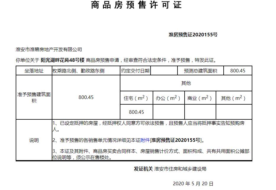 - 淮房预售证2020155号 详情发证时间 2020-05-20绑定楼栋48号楼证件照片
