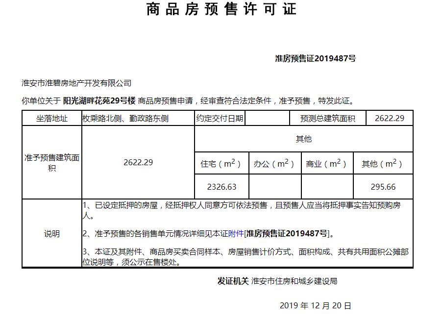 - 淮房预售证2019487号 详情发证时间 2019-12-20绑定楼栋29号楼证件照片