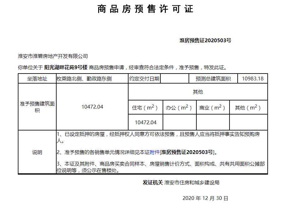 - 淮房预售证2020503号 详情发证时间 2020-12-30绑定楼栋9号楼证件照片