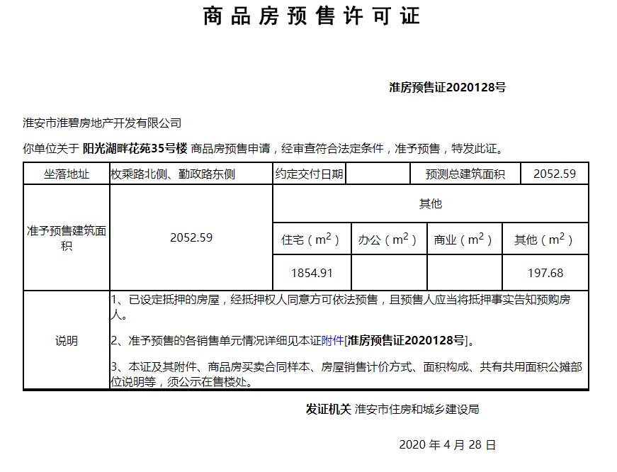 - 淮房预售证2020128号 详情发证时间 2020-04-28绑定楼栋35号楼证件照片