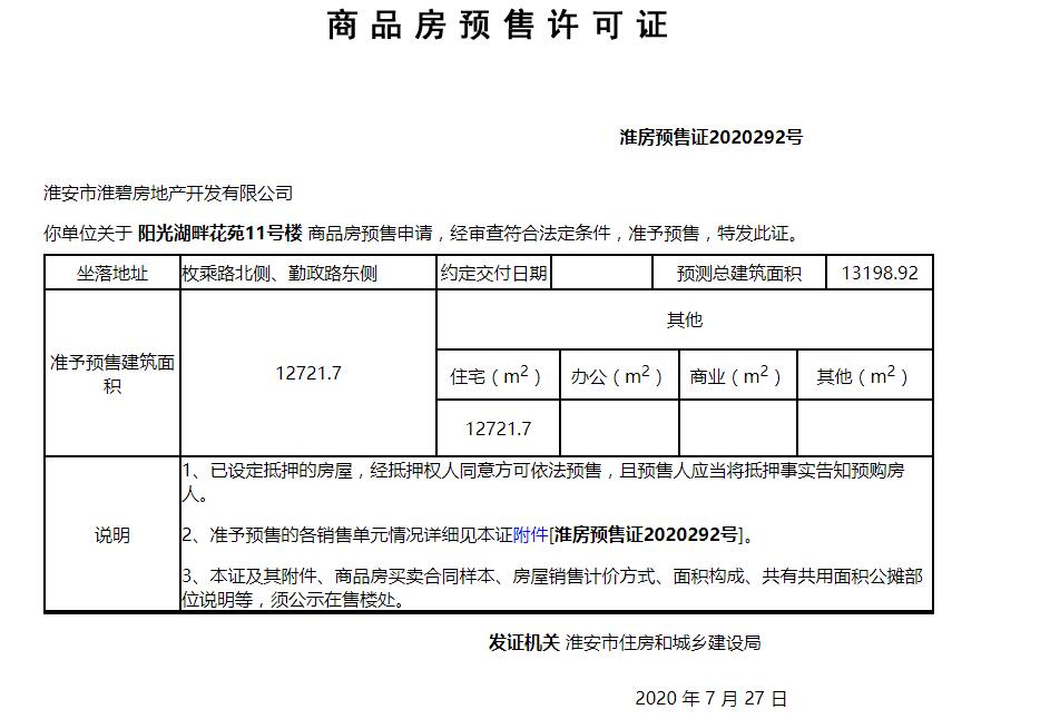 - 淮房预售证2020292号 详情发证时间 2020-07-27绑定楼栋11号楼证件照片