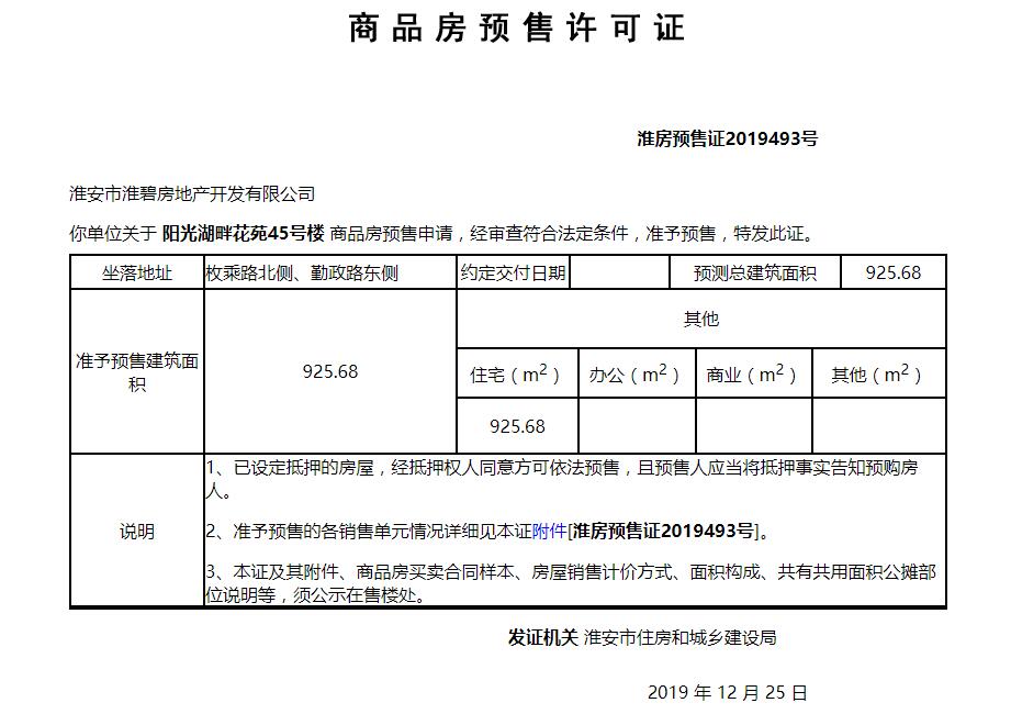 - 淮房预售证2019493号 详情发证时间 2019-12-25绑定楼栋45号楼证件照片