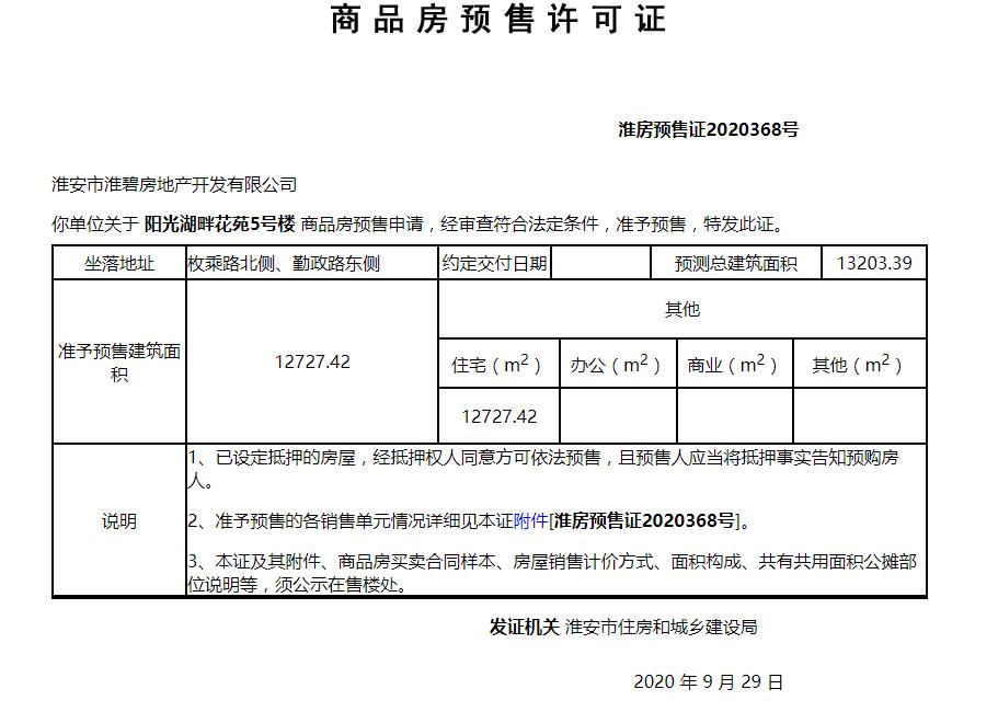 - 淮房预售证2020368号 详情发证时间 2020-09-29绑定楼栋5号楼证件照片