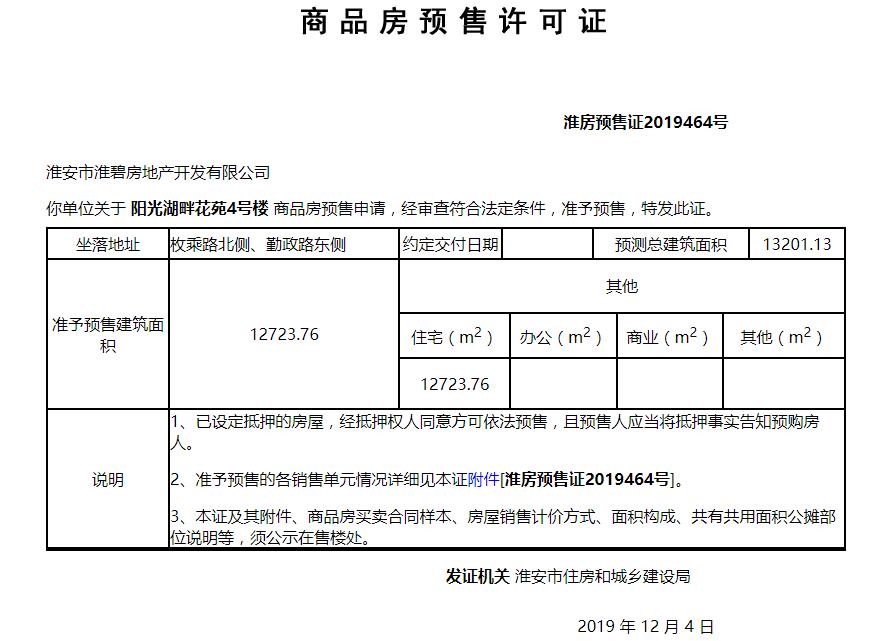 - 淮房预售证2019464号 详情发证时间 2019-12-04绑定楼栋4号楼证件照片