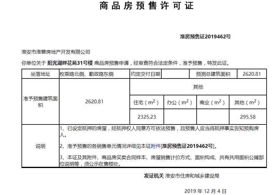 - 淮房预售证2019462号 详情发证时间 2019-12-04绑定楼栋31号楼证件照片