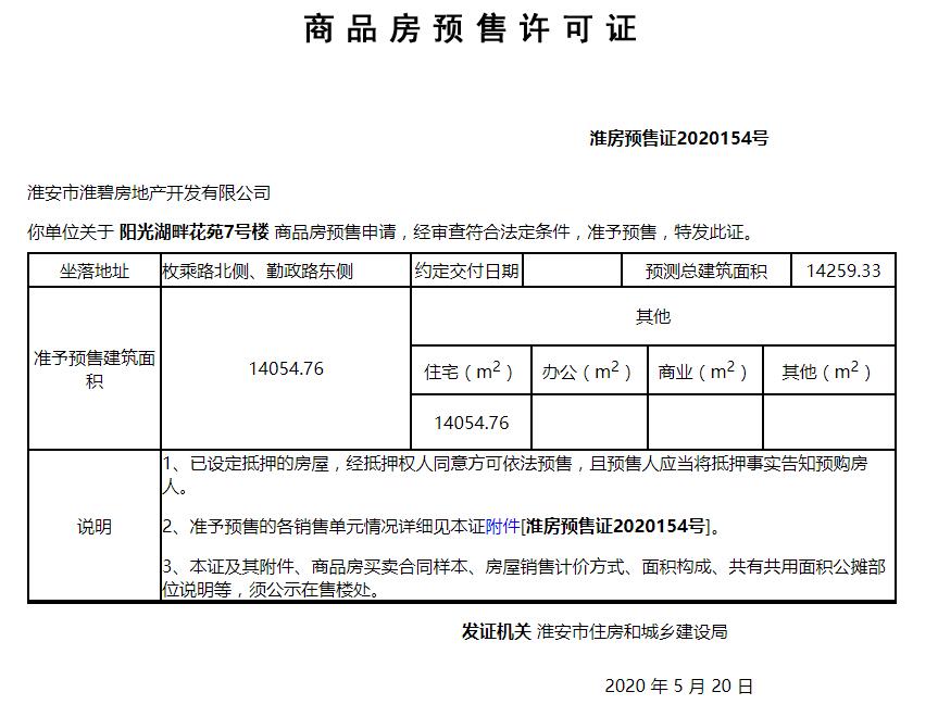 - 淮房预售证2020154号 详情发证时间 2020-05-20绑定楼栋7号楼证件照片