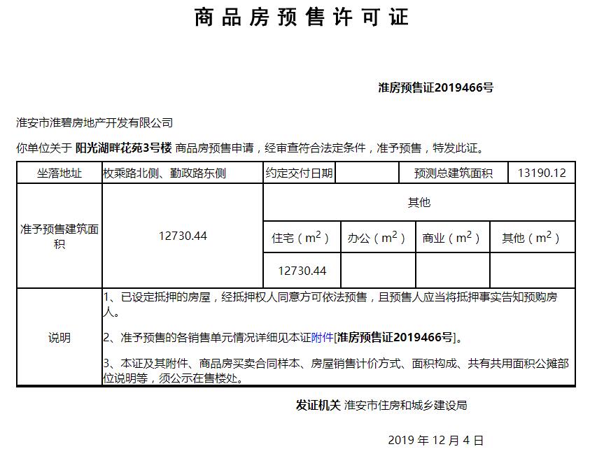 - 淮房预售证2019466号 详情发证时间 2019-12-04绑定楼栋3号楼证件照片