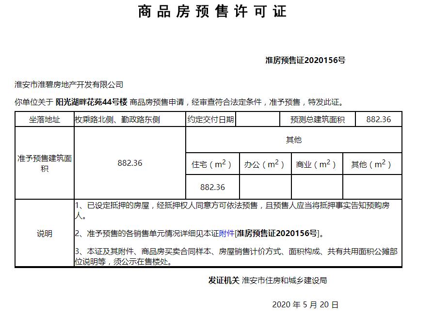 - 淮房预售证2020156号 详情发证时间 2020-05-20绑定楼栋44号楼证件照片