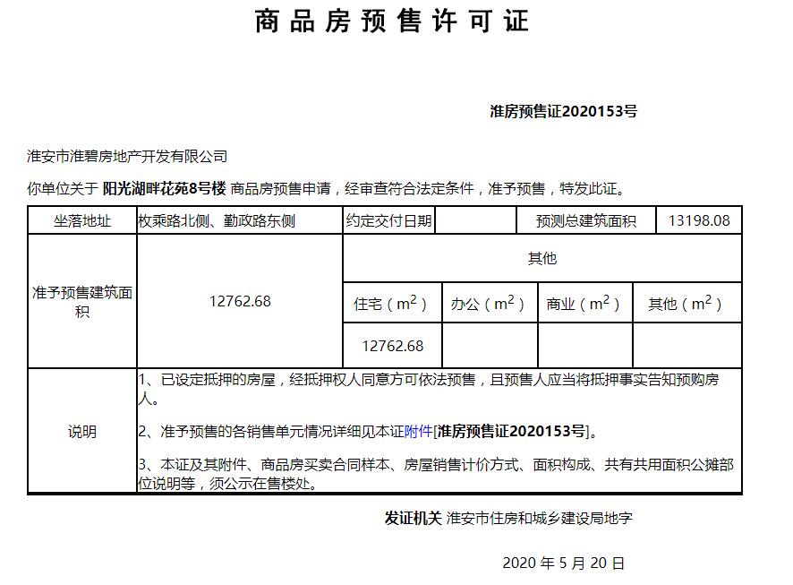- 淮房预售证2020153号 详情发证时间 2020-05-20绑定楼栋8号楼证件照片