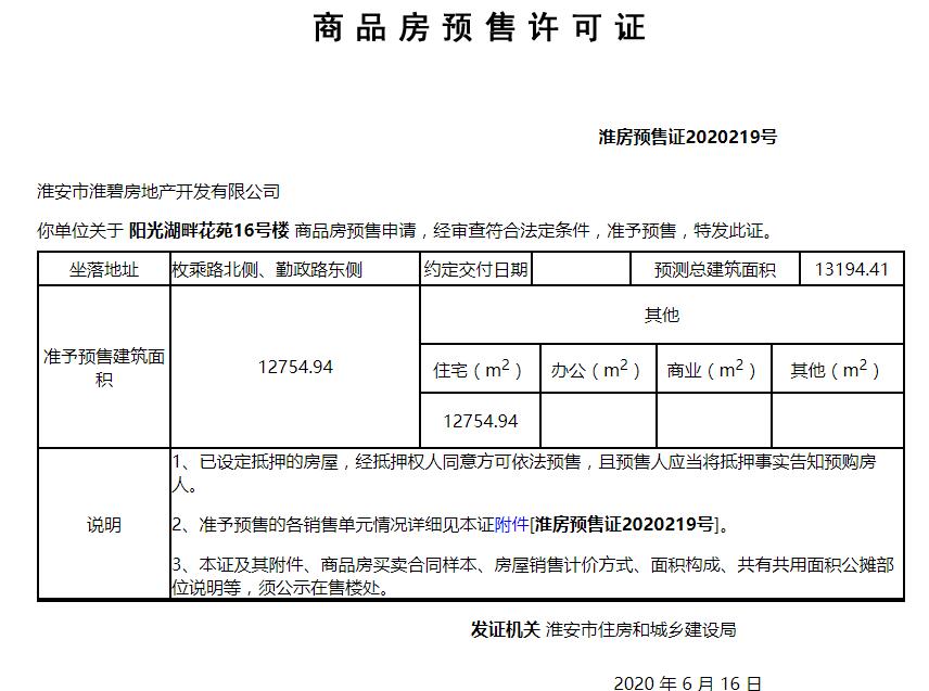 - 淮房预售证2020219号 详情发证时间 2020-06-16绑定楼栋16号楼证件照片