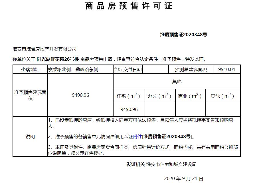 - 淮房预售证2020348号 详情发证时间 2020-09-21绑定楼栋26号楼证件照片