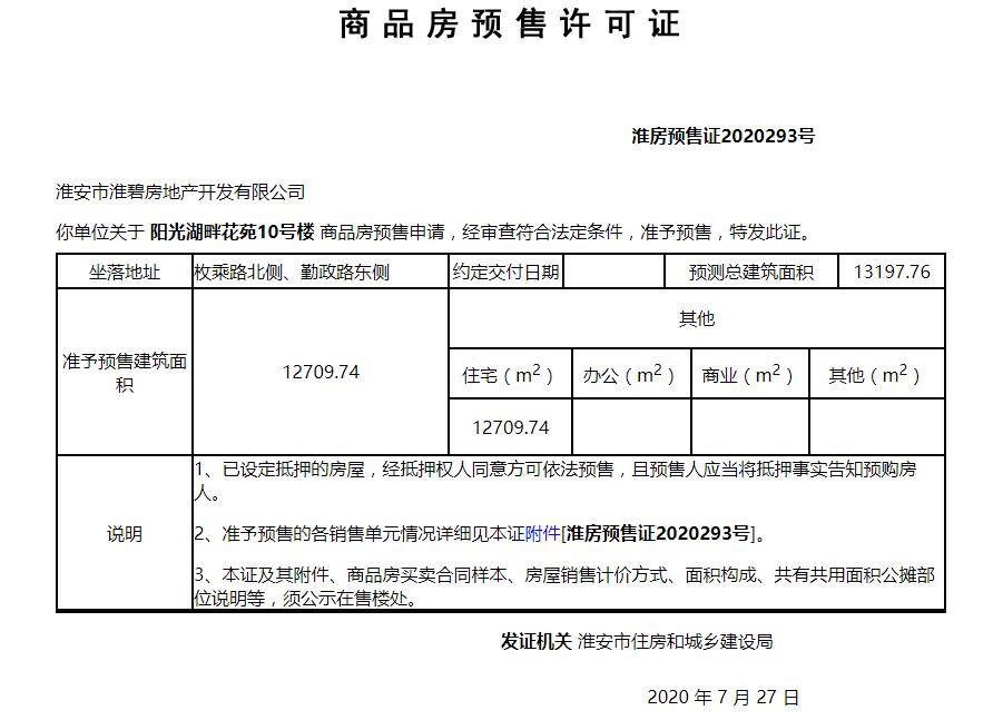 - 淮房预售证2020293号 详情发证时间 2020-07-27绑定楼栋10号楼证件照片