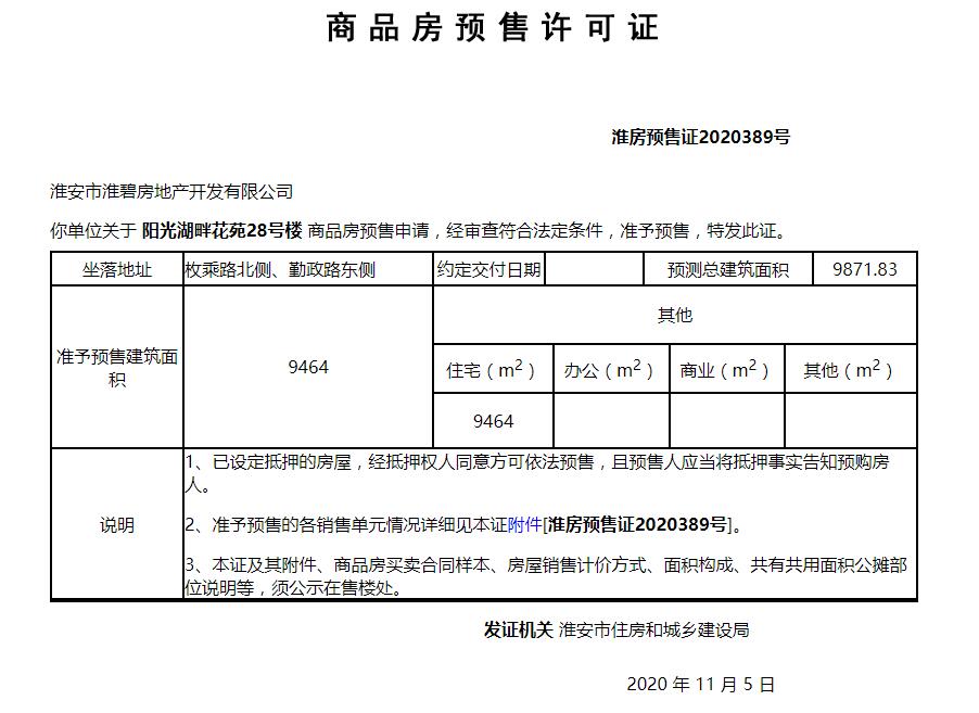 - 淮房预售证2020389号 详情发证时间 2020-11-05绑定楼栋28号楼证件照片