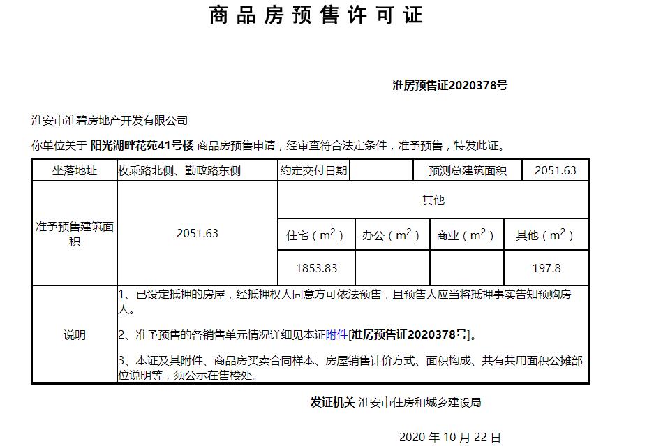 - 淮房预售证2020378号 详情发证时间 2020-10-22绑定楼栋41号楼证件照片