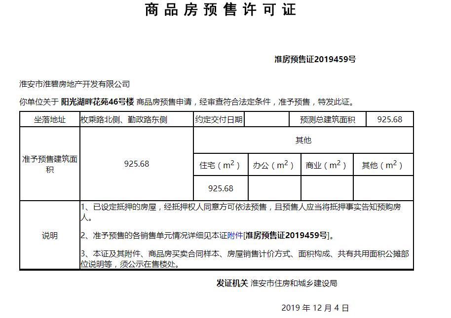 - 淮房预售证2019459号 详情发证时间 2019-12-04绑定楼栋46号楼证件照片