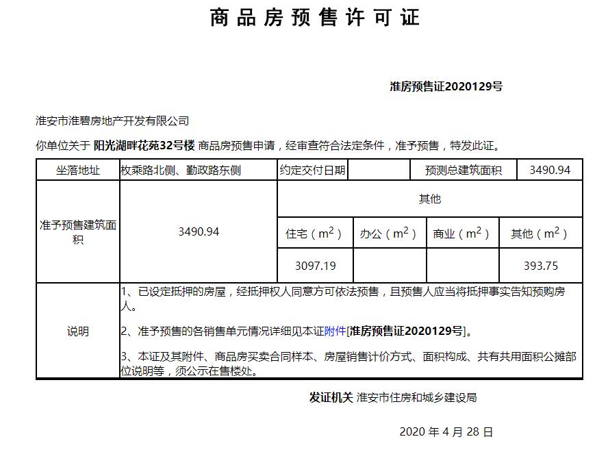 - 淮房预售证2020129号 详情发证时间 2020-04-28绑定楼栋32号楼证件照片