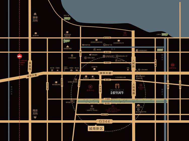 医院:金湖县人民医院;教育:吴运铎实验学校;商业:学苑广场(在建)、黎城便民菜场(在建)、华润苏果;银行:常熟银行;社区内配套:幼托养老中心;其他:政务中心、文化艺术中心、科创园、尧帝古城、樱花大道