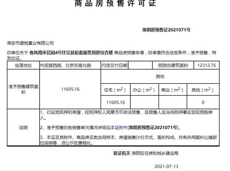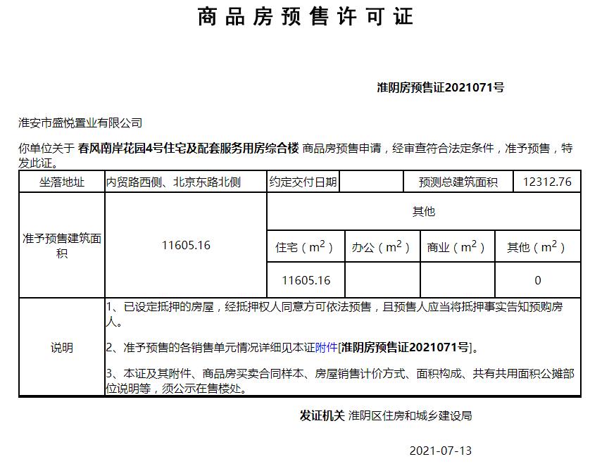 - 淮阴房预售证2021071号 详情发证时间 2021-07-13绑定楼栋4号楼证件照片