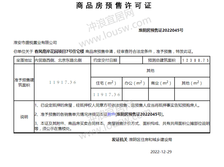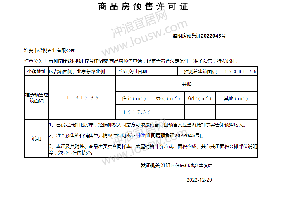 - 淮阴房预售证2022045号 详情发证时间 2022-12-29绑定楼栋春风南岸7号楼高层证件照片