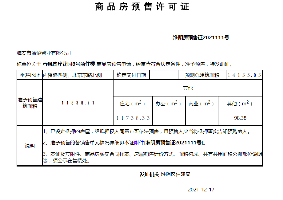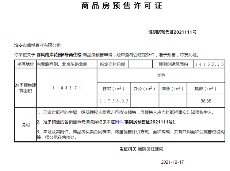 - 淮阴房预售证2021111号 详情发证时间 2021-12-17绑定楼栋春风南岸花园6号楼住宅证件照片