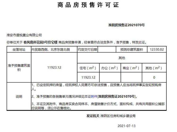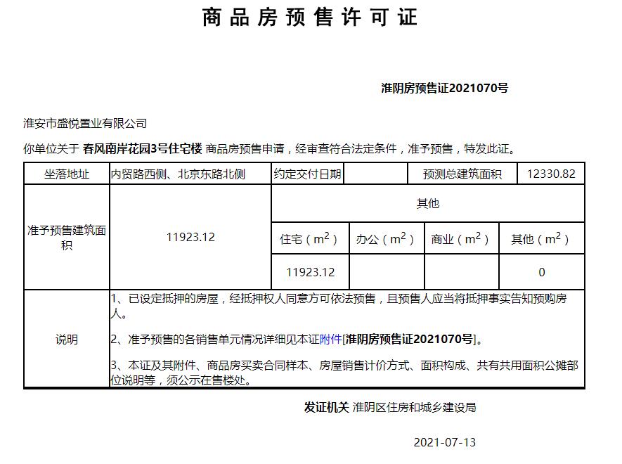 - 淮阴房预售证2021070号 详情发证时间 2021-07-13绑定楼栋3号楼证件照片
