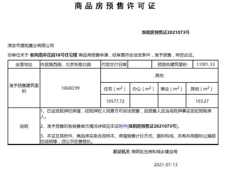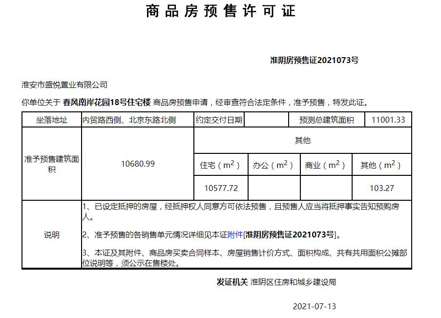 - 淮阴房预售证2021073号 详情发证时间 2021-07-13绑定楼栋18号楼证件照片
