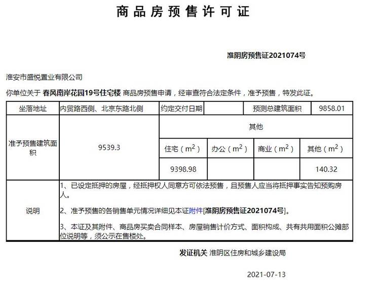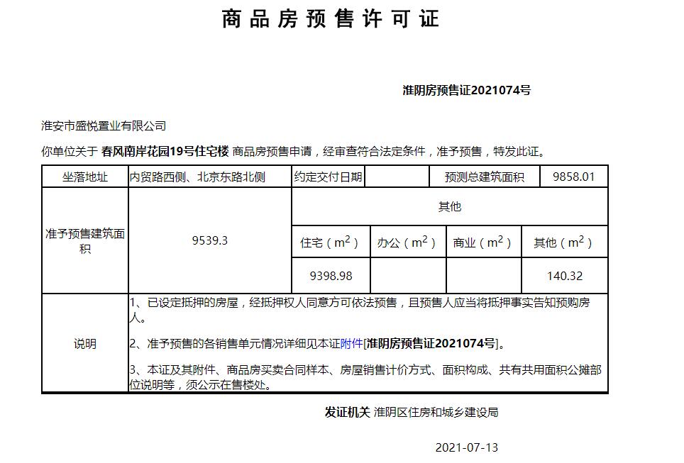 - 淮阴房预售证2021074号 详情发证时间 2021-07-13绑定楼栋19号楼证件照片