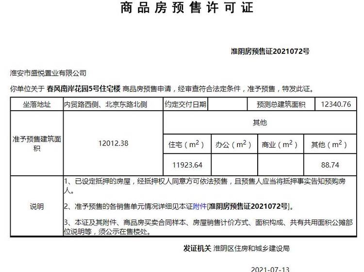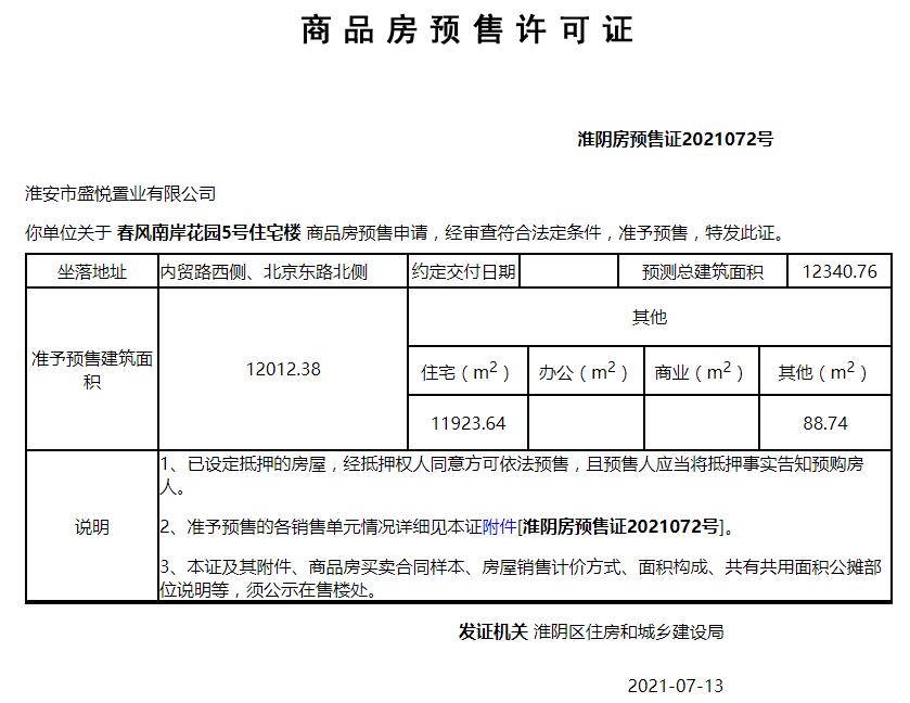 - 淮阴房预售证2021072号 详情发证时间 2021-07-13绑定楼栋5号楼证件照片