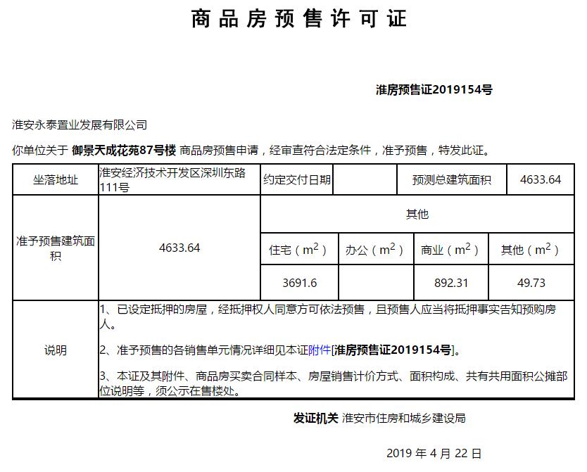 - 淮房预售证2019154号 详情发证时间 2019-04-22绑定楼栋御景天成花苑87号楼证件照片