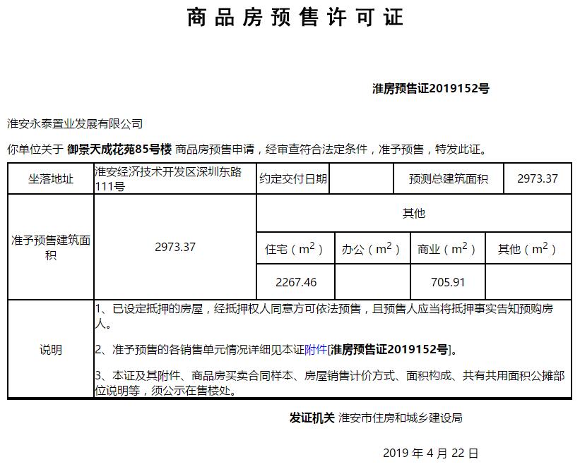 - 淮房预售证2019152号 详情发证时间 2019-04-22绑定楼栋御景天成花苑85号楼证件照片