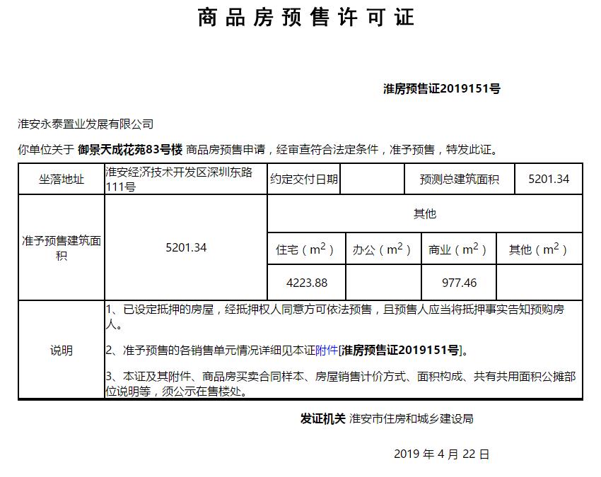 - 淮房预售证2019151号 详情发证时间 2019-04-22绑定楼栋御景天成花苑83号楼证件照片