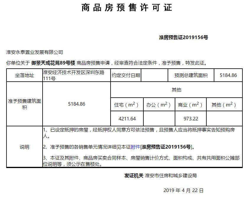 - 淮房预售证2019156号 详情发证时间 2019-04-22绑定楼栋御景天成花苑89号楼证件照片