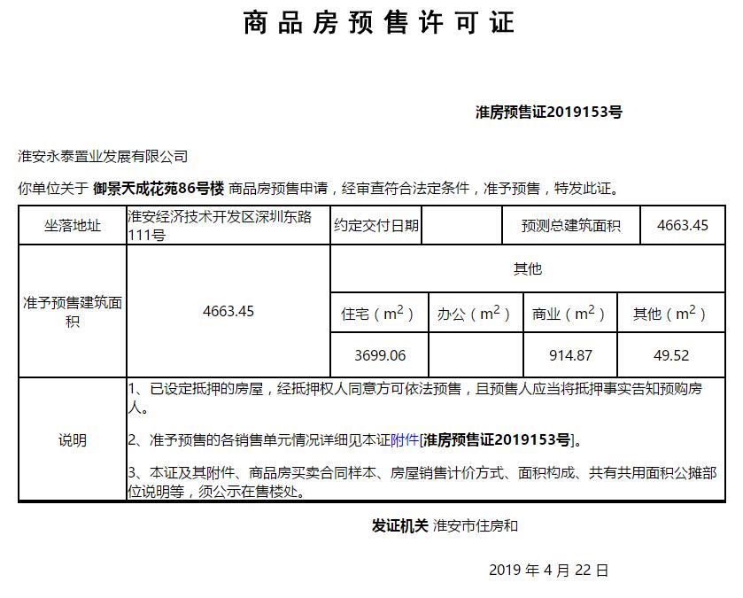 - 淮房预售证2019153号 详情发证时间 2019-04-22绑定楼栋御景天成花苑86号楼证件照片