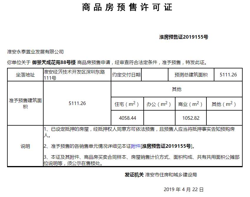 - 淮房预售证2019155号 详情发证时间 2019-04-22绑定楼栋御景天成花苑88号楼证件照片