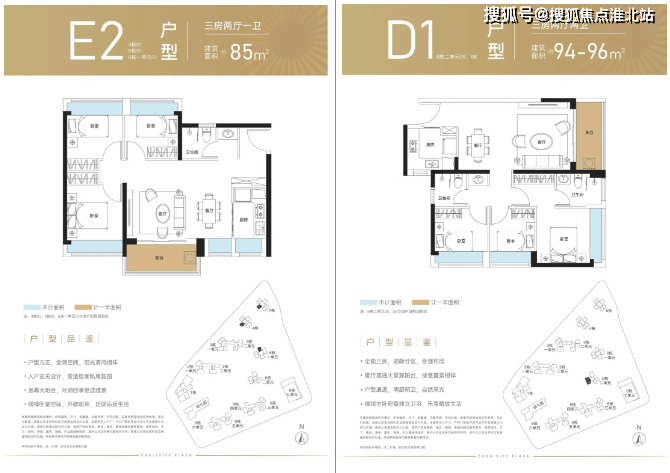 85㎡的 3 房 2 厅 1 卫:横厅南北通透格局,客厅 3.5 米开间,L 型厨房,卫生间三段式分离设计,得房率 72.95%,阳台主朝东南或西南向看小区园林。