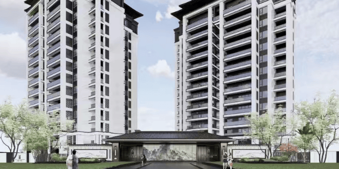 采用中式园林风格,以魏晋风骨、两宋文蕴为底蕴,打造两进山水园林。一进山水院,以叠石奇景、精巧花木为主,营造如居山中的归家体验;二进镜水院,以水景、曲桥、角亭为主,呈现中式园林空间,还通过环绕式连廊、点景亭台、曲桥竹径将山水园境串联。