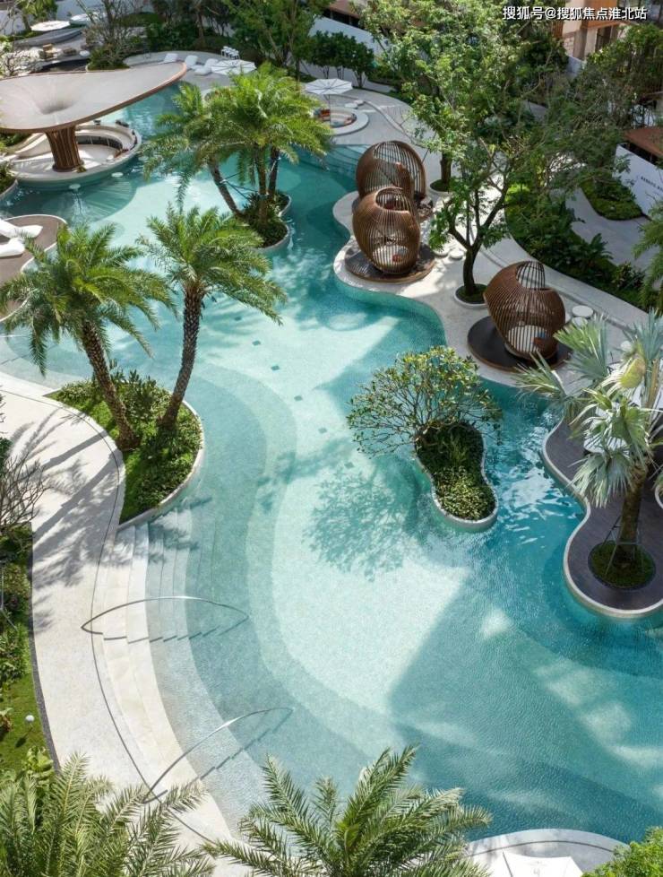 洋房区以泳池为核心,自然流动的曲线,放松的海岛布置,紧密围绕这些开展社区的水上活动,泳池派对,同时又是一种热带海岛的度假体验。