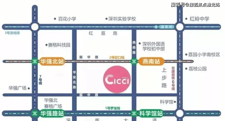 宝树台华玺公馆位于福田重要地段,地处深圳市福田区核心地段的CICCI Mall,南接华强北商圈,西望福田CBD,邻近莲花山公园、笔架山、银湖等自然风景区,地理位置十分优越。从交通上来看,CICCI Mall无缝接驳地铁2号线燕南站,周边汇集1号线、2号线、3号线、6号线(建设中)、7号线、9号线等六条地铁线,700米范围内汇聚9个地铁站出入口和21个公交车站台,数十路公交车经停这些站台,交通十分便利。
