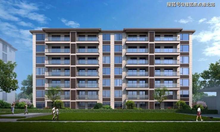 建筑设计:项目规划 6 栋 7 层和 2 栋 8 层洋房,外立面采用现代简约风,建筑主体采用米色真石漆,顶部挑檐设计,线条简洁,配色清爽。