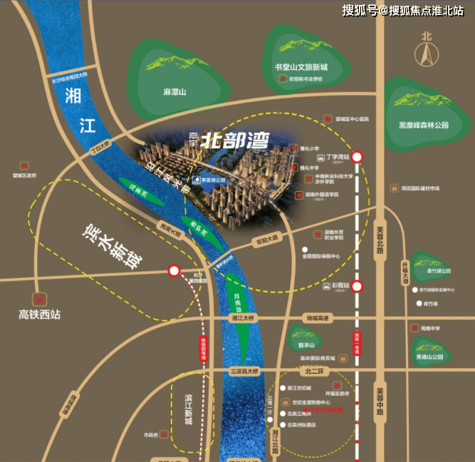 整体布局:整体规划设计以 “山・水・洲・城” 为理念,项目围绕约 350 亩的李家湖公园而建,坐拥约 1.5 公里江岸线,是长沙少有的南向看江的江景房。