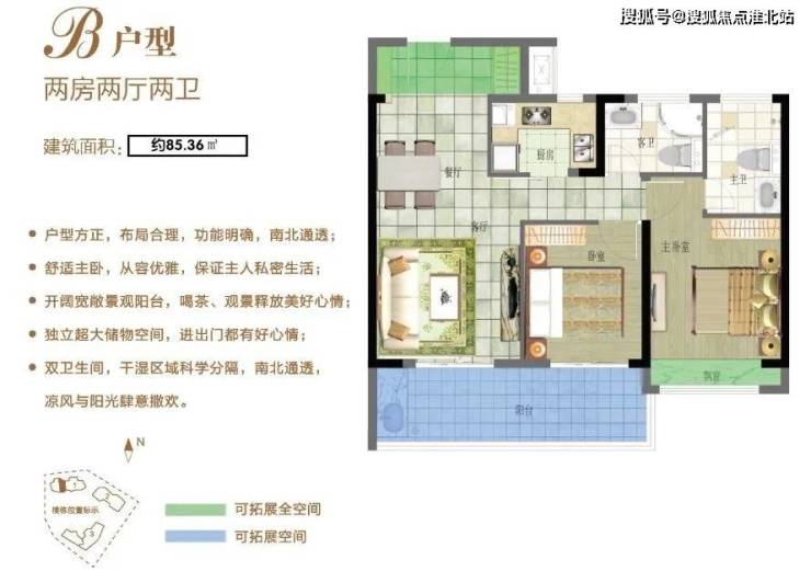 B户型:85.36㎡两房两厅两卫