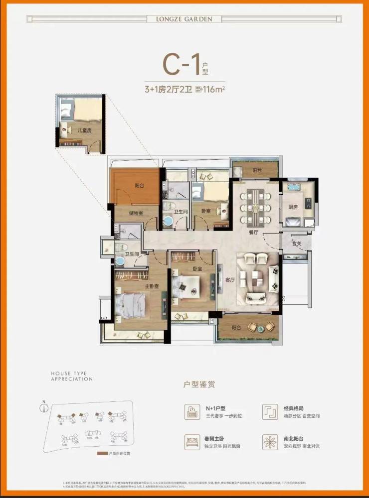 建面约116㎡3+1房,是约97㎡户型的镜像升级版,室内各功能区布局与其一样,区别在于多了一个北向的次卧。