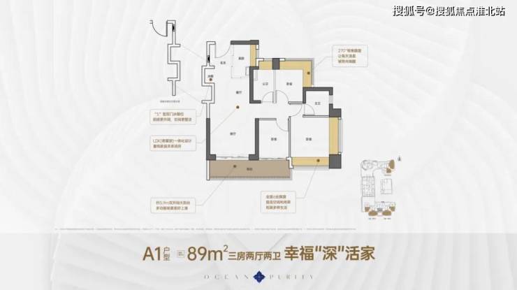 其中建筑面积约89㎡的3房2厅2卫,竖厅格局,“S”型双门冰箱位、LDK一体化设计;约5.9米长的大阳台,全屋5-6处飘窗,提高空间利用率。